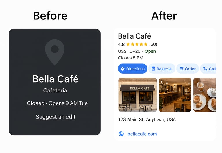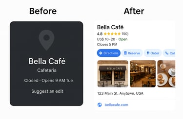 After: Optimized profile with high-quality photos, updated hours, and improved ranking for “coffee shop in New Yor